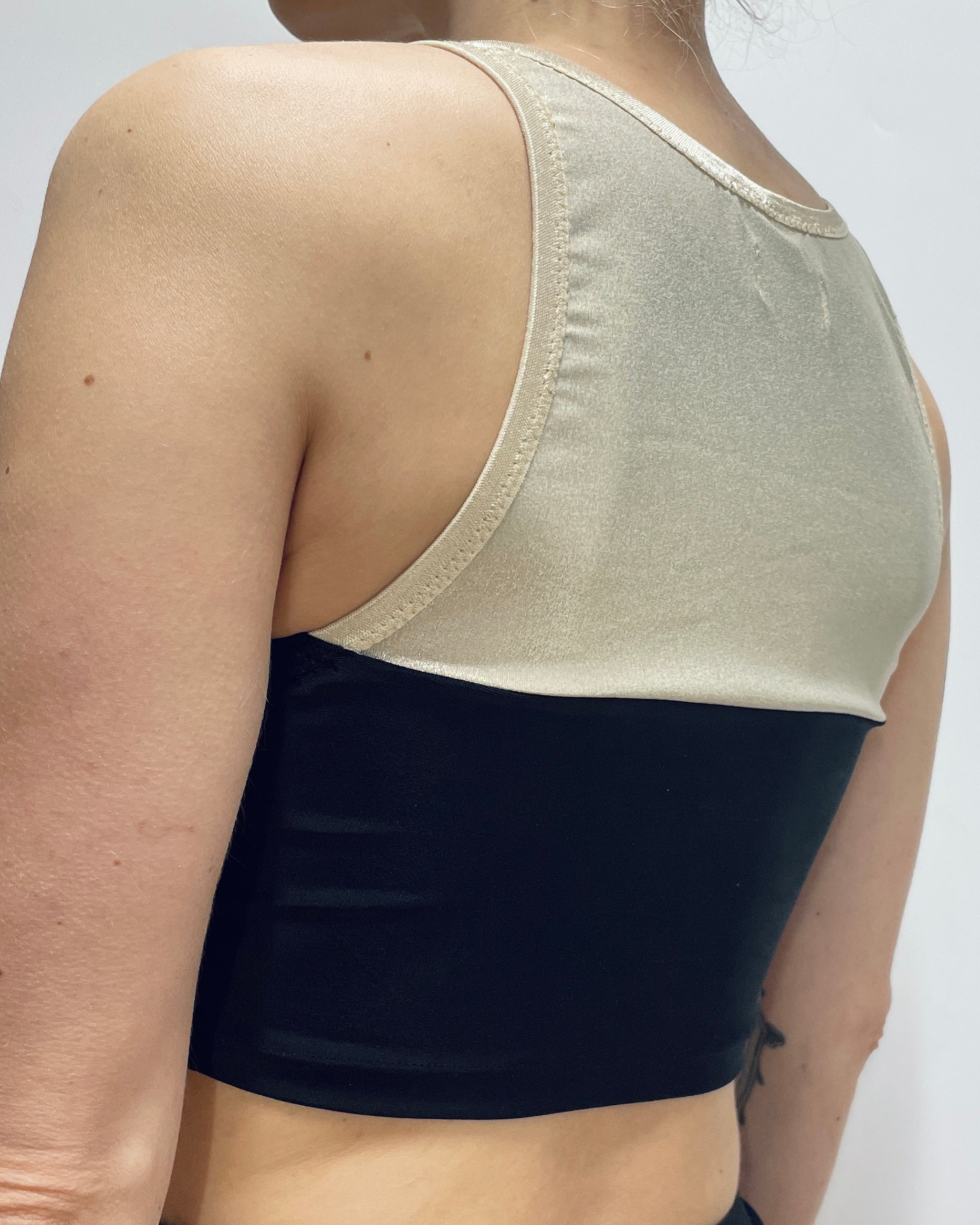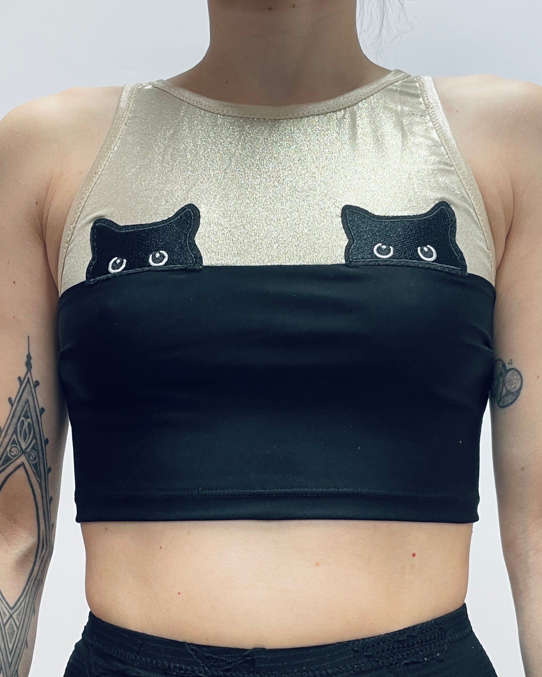 Two tone top - black lycra and shimmery gold lycra - with cat embroidery. This top does not have bra insert option!