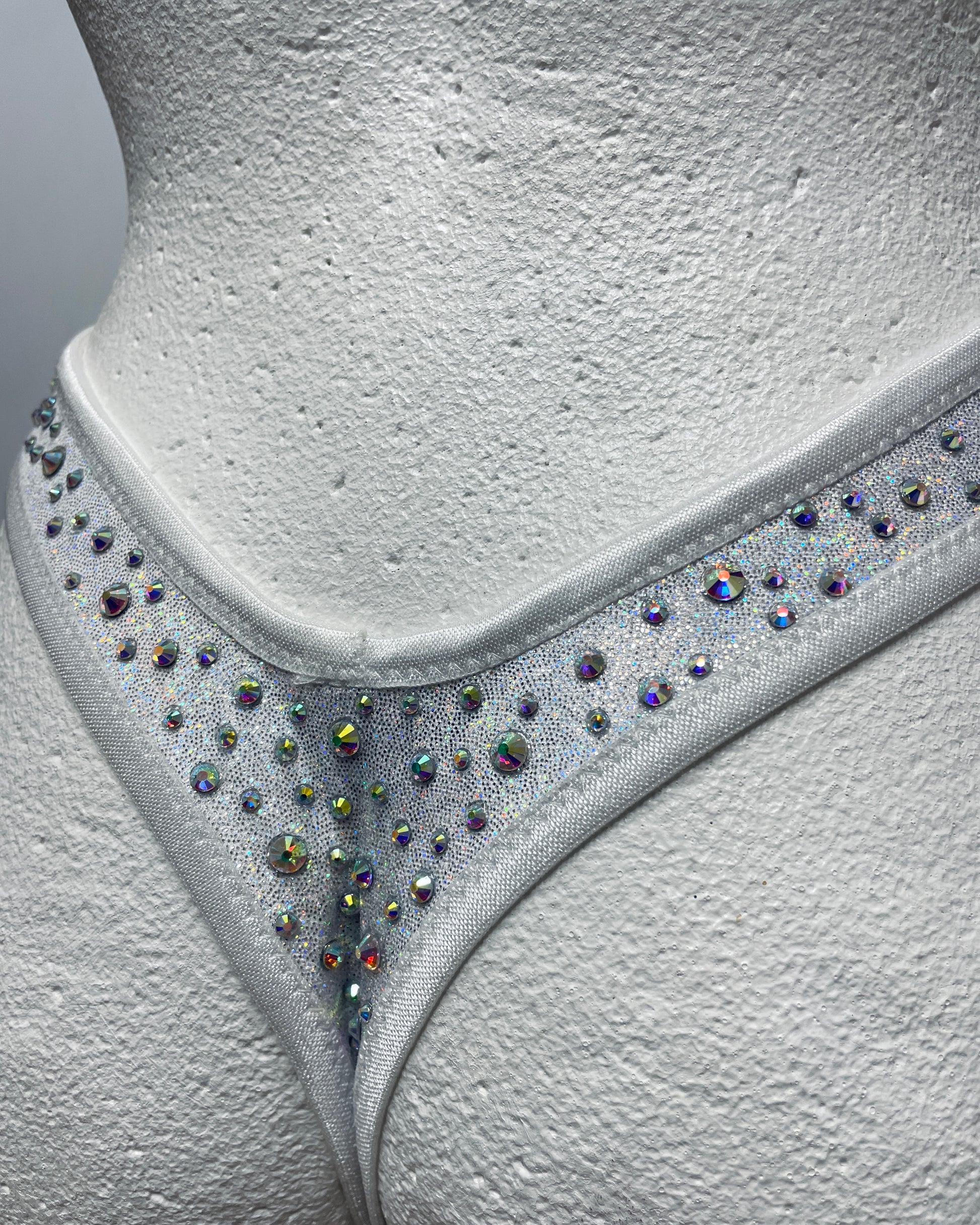 Revealing high leg cut bottoms from white shimmery velvet and hand glued rhynestones.