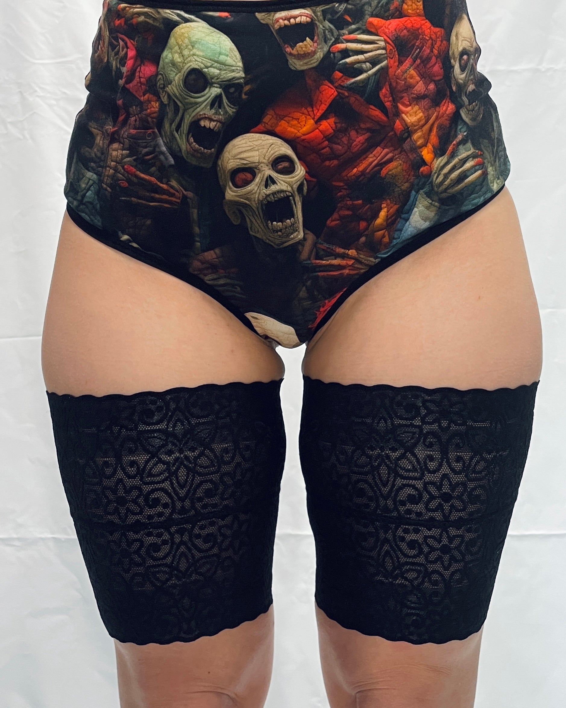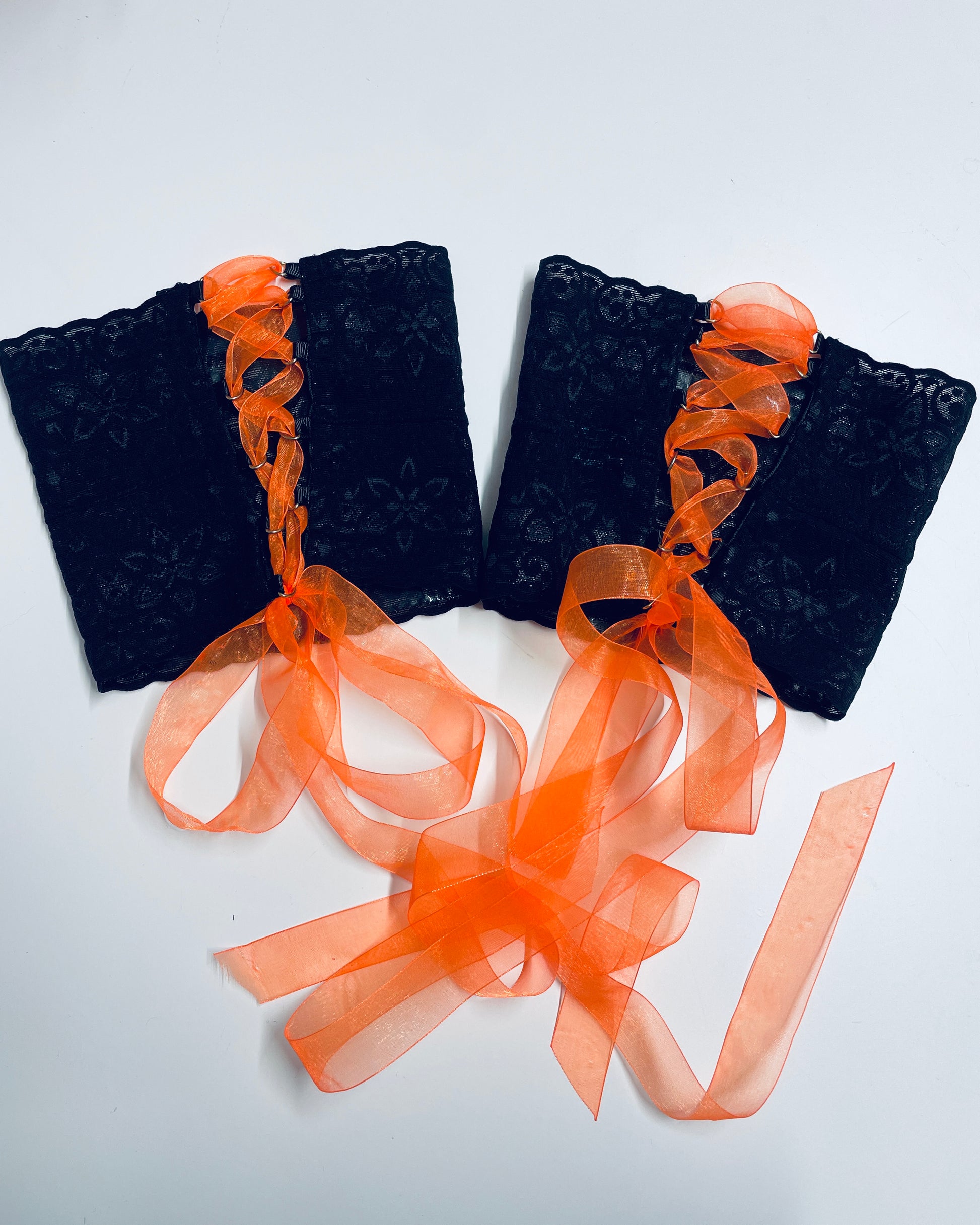 Black lace garters with silicone stripes on upper and bottom edge. Garters comes with orange and black lacing!