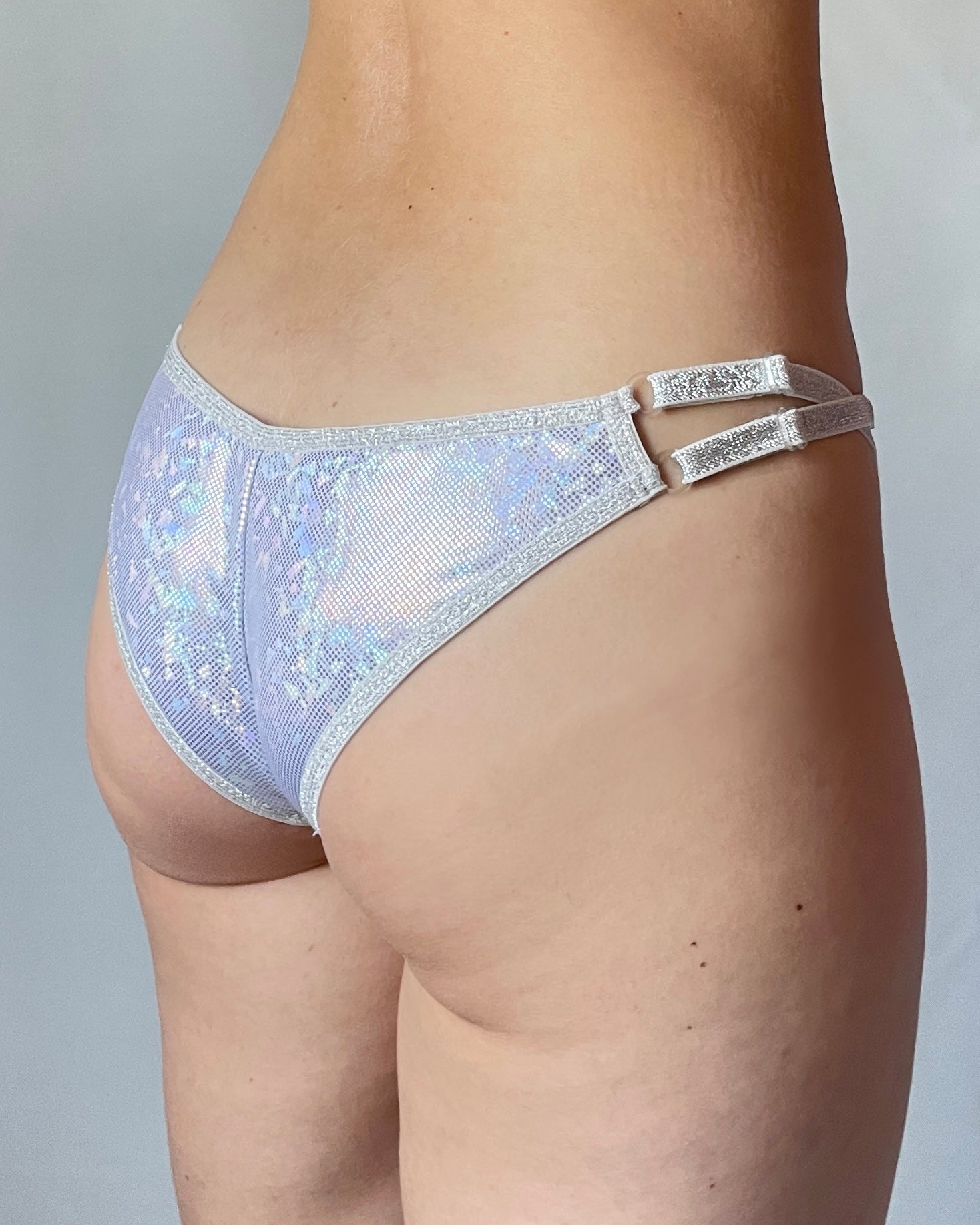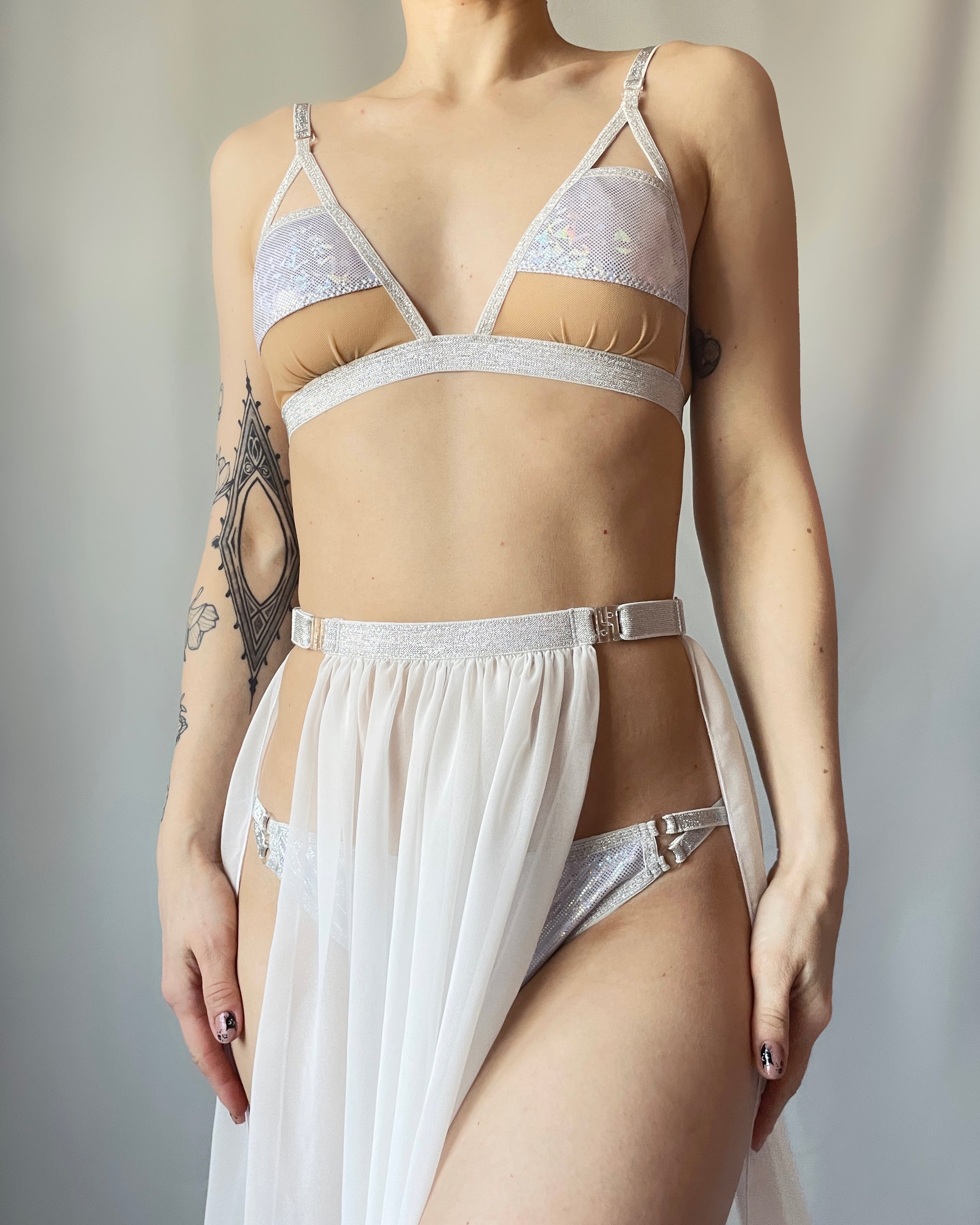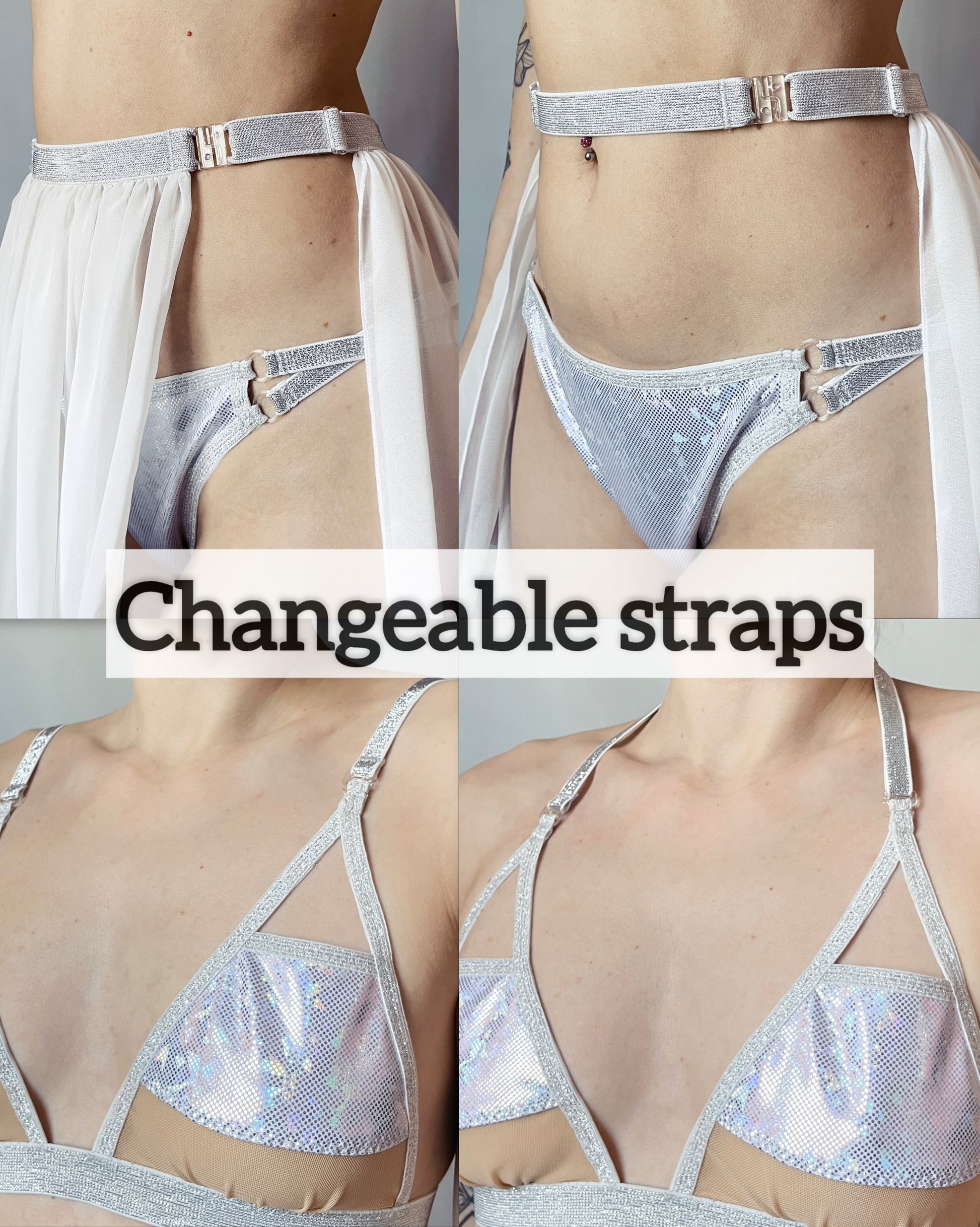 This is a 3-piece set: top, bottoms and long skirt. Top and bottoms are made from hologram rainbow foil print lycra and skirt from chiffon fabric. Top has adjustable changeable shoulder straps and skirt has adjustable changeable front piece/strap.
